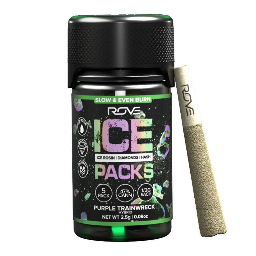 Rove Ice Packs, the world’s first triple-infused preroll. Made with premium-grade flower fully-infused with THCA diamonds and solventless ice hash rosin then they’re expertly rolled. Super smooth and ultra potent, Rove Ice Packs test up to 40% THC. Welcome to the next evolution of prerolls. Premium Organic Flower. Enjoy an unbeatable combination of deep relaxation and cerebral buzz – perfect for chill evenings, creative sessions, stress relief, or just a great time.